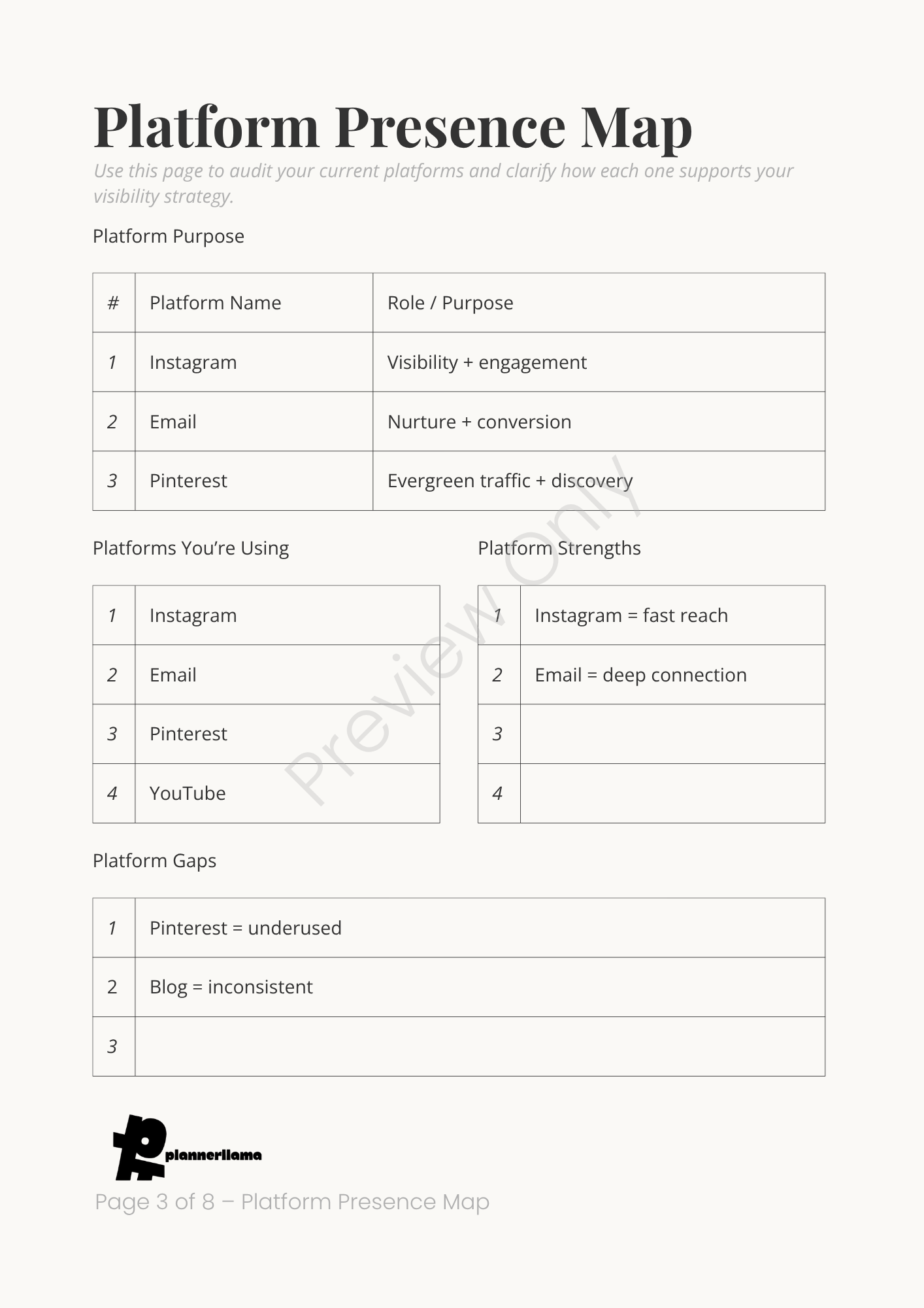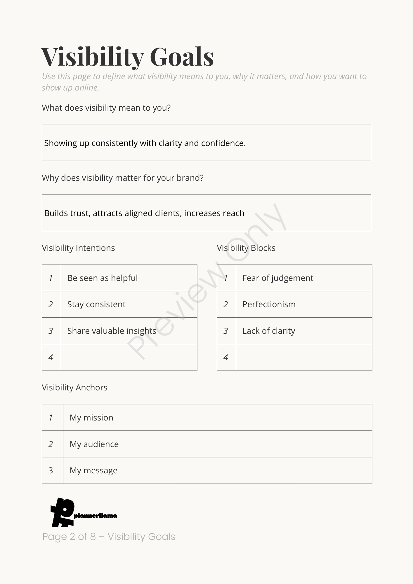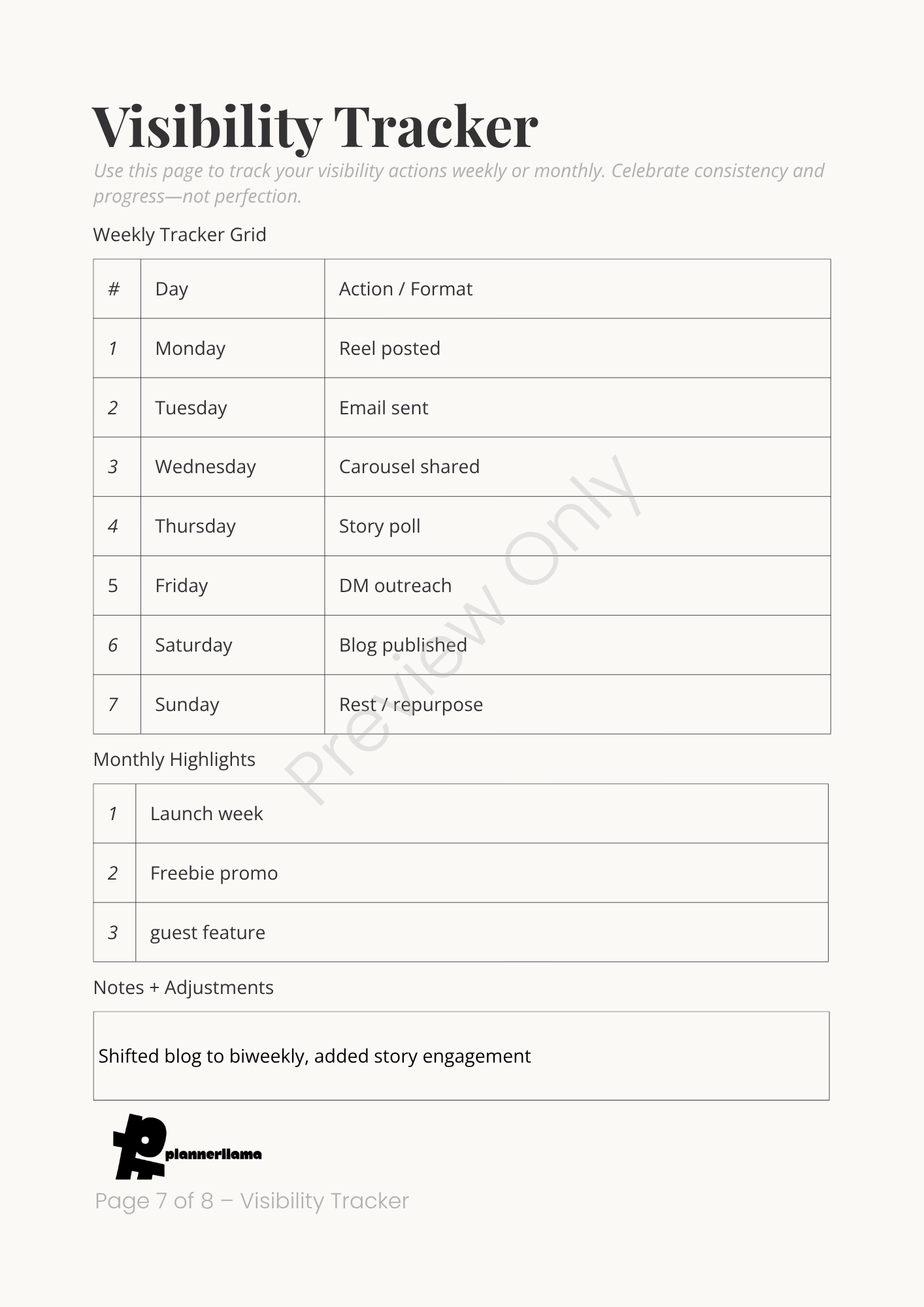 Plannerllama’s Visibility Planner is the seventh module in our 10-part Business Plan Planner system designed for digital entrepreneurs, creators, and small business owners who want to build a sustainable, strategic visibility rhythm.
