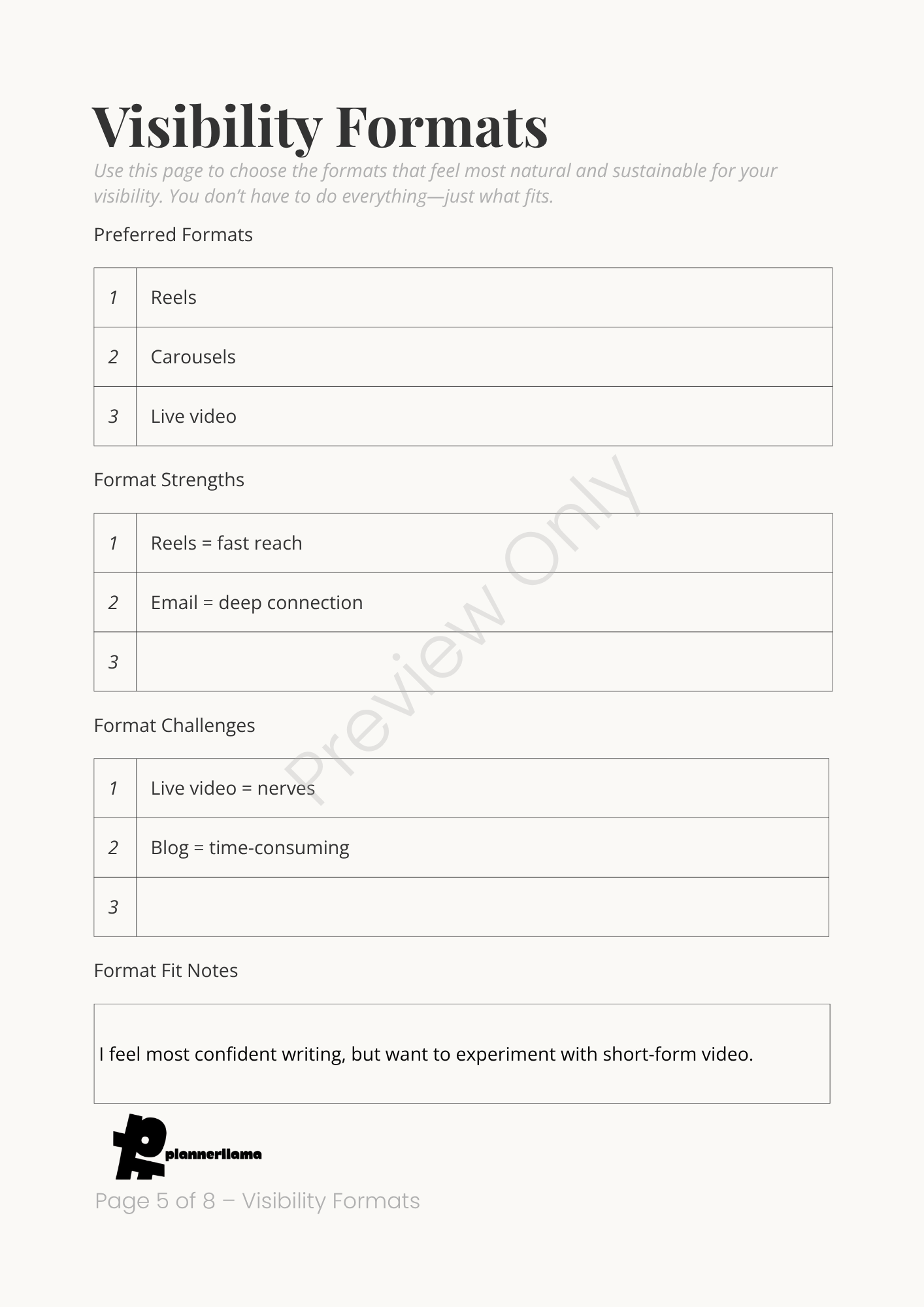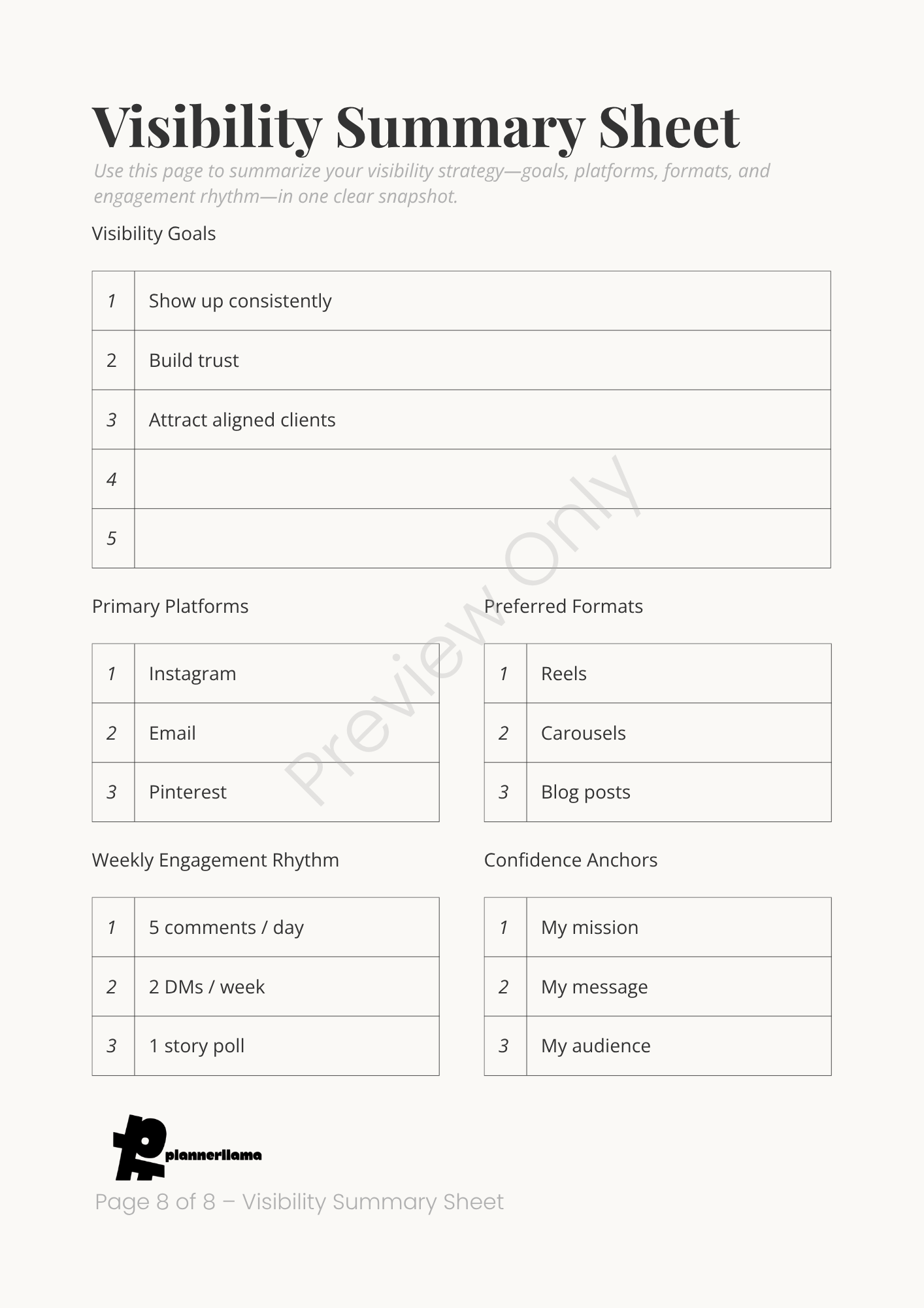 This 8-page printable and fillable planner PDF helps you define your visibility goals, audit your platforms, choose formats, and track weekly engagement with confidence.