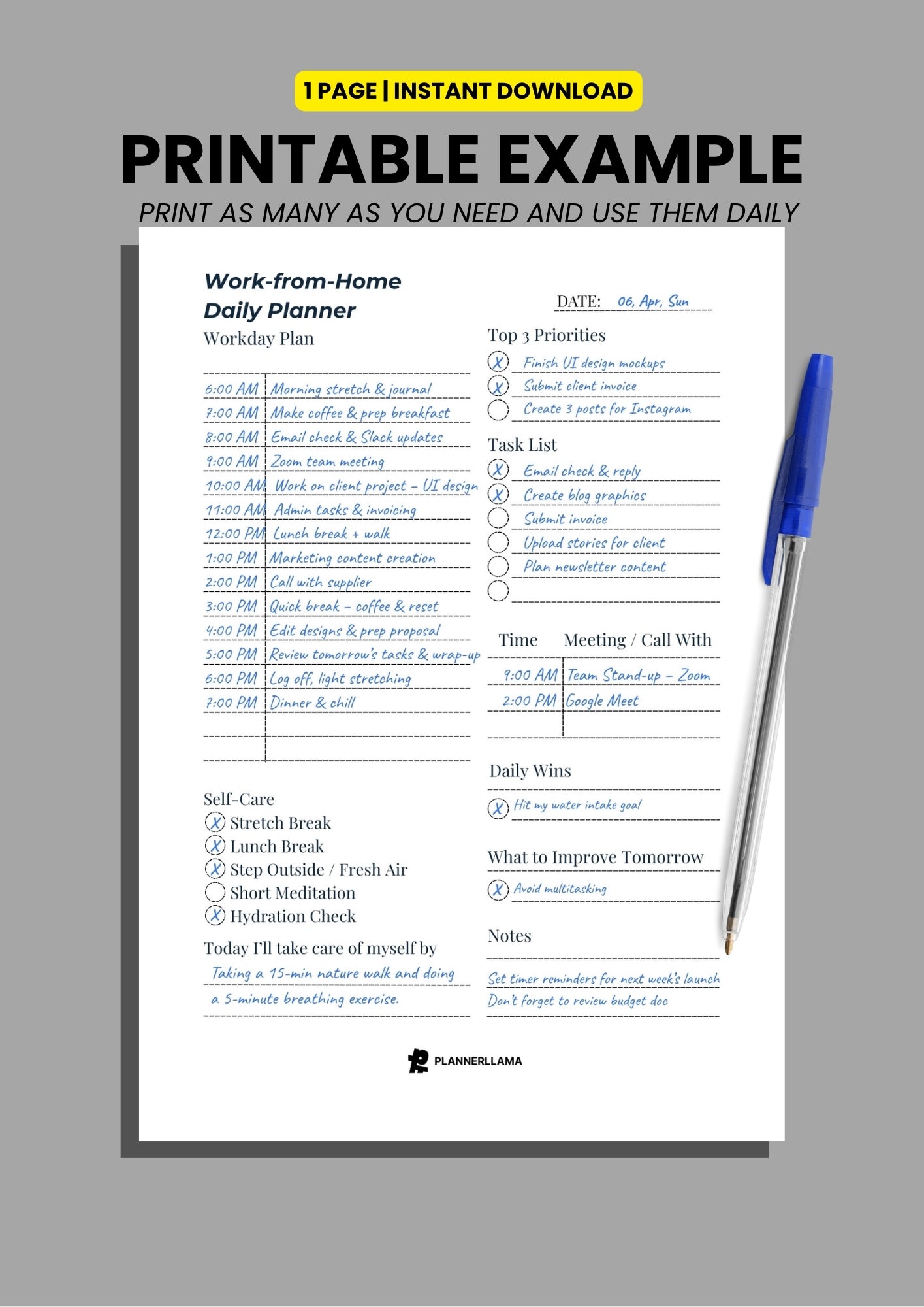 Work-from-Home Daily Planner – Time Block & Task Focused – Undated, Printable & Fillable (A4/A5/Half Letter/US Letter) – Plannerllama